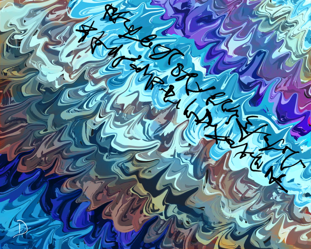 As I often do, I began my evening by listening to music and opening my painting program. The music selection was found on YouTube, something called [2025] Feeling Good Mix – Billie Eilish, Cigarettes After Sex, Emma Peters, Edmofo, Omer Balik #5. I liked the music, but found it quite emotional – quite sad, but beautiful. Once the music was underway, I selected a bristle brush that allows a mix of colors to be applied. I built up several layers using the colors seen below. At first, I thought it might reflect “A New Flame” – an Elvis song I had listened to earlier. As the Feeling Good Mix music continued, I found myself seeing the strokes on the canvas as being an ocean of emotions. I added the asemic text to leave a message, but I did not know what it was at the time.