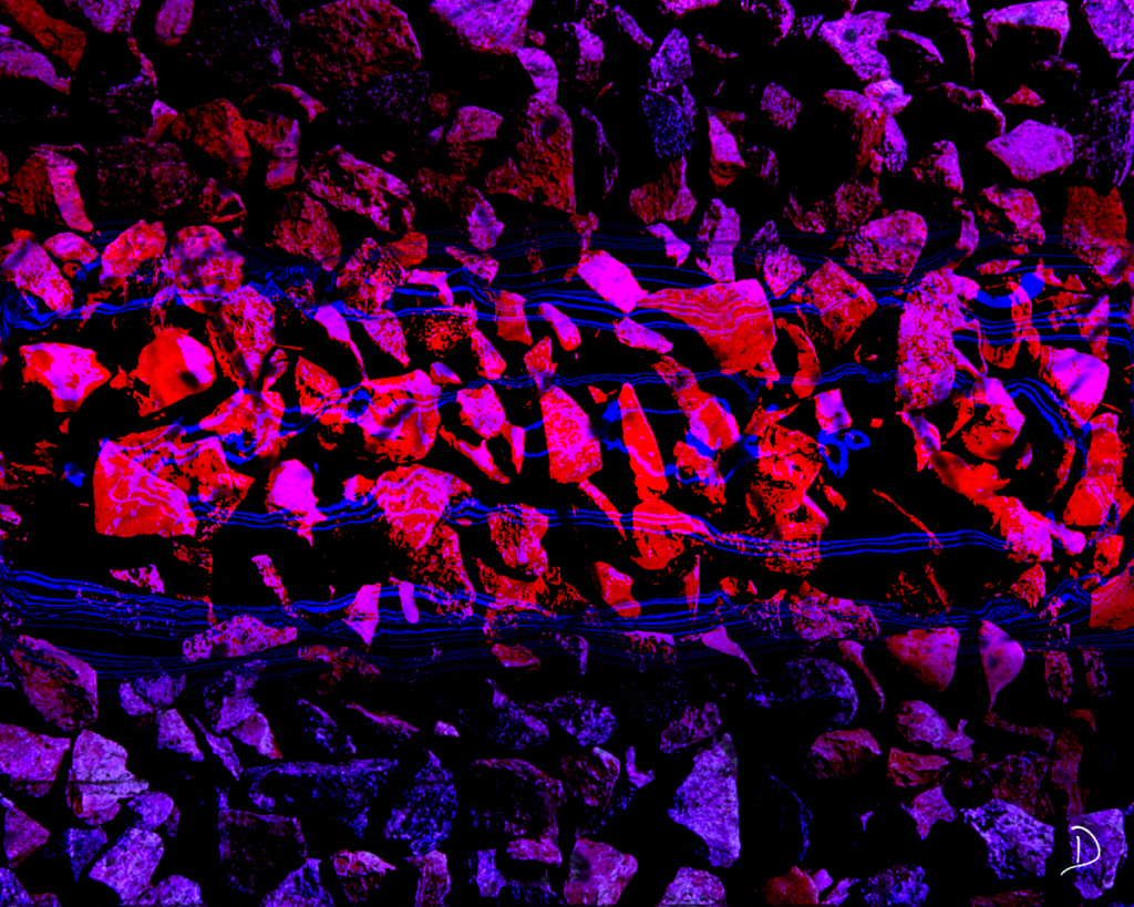 This last piece came to be through experimentation with textures. I blended together a simple pastel colored painting, a photo of some rocks I took in the past, and a few simple paint strokes that ended up looking like a stream of water. It came to be after I had produced the pumphouse artwork, and once it was complete I thought it was symbolic of the river that runs through Saskatoon, the river that once fed the pumphouse, the one that continues to provide drinking water to all the cities and towns it passes through – the lifeblood of our nation, one could say.