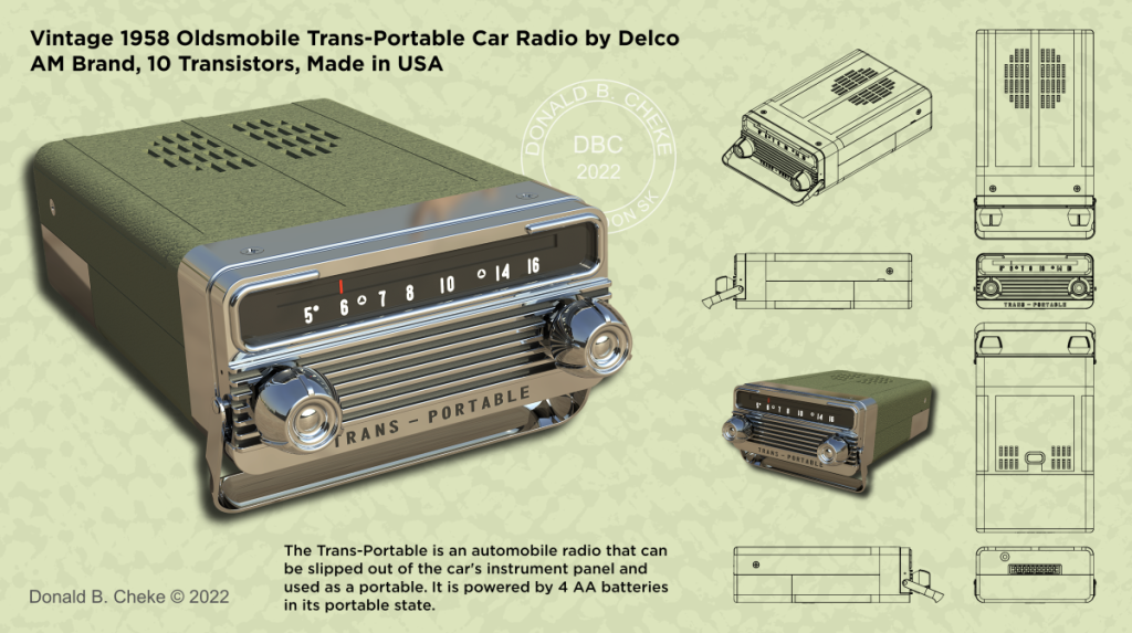 The trans-portable radio was something I stumbled upon in 2022 while looking for things to 3D model. I found a picture online within a brochure for the car/devise. I was so surprised to learn that as far back as 1958, there was a removable dash-mounted radio that owners could pop out and listen to while picnicking, or some other outside activity. The brochure was not as detailed as mine, but because I made a 3D model, I could show all the orthogonal views in line-drawing format, and some isometric views in rendered image format. Isn’t it one of the coolest things you have ever seen! I just love it!