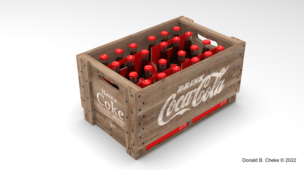 In a blog post not long ago, I talked about a vintage filling station and how the only thing missing was a deck for old men to sit around sipping Coke and shooting the breeze. With this in mind, I chose to feature a Coke crate I 3D modeled and rendered in 2022. This vintage look sure brings back a lot of great memories for me. I modeled the Coke product because of its status as an iconic design, but I prefer Pepsi – have for as far back as I can remember.