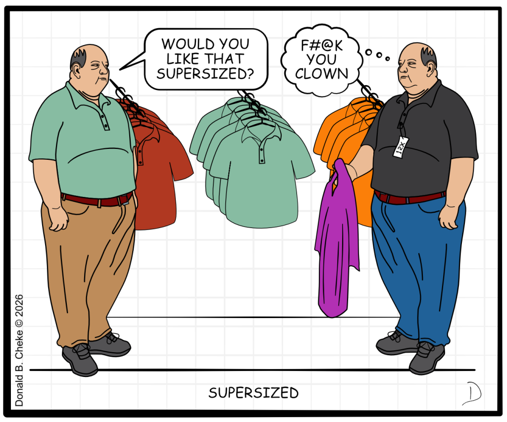 After I ordered the new shirts today, one size up, I thought of the cartoon below. I grabbed the supersized bit when I thought about that whole supersize business with McDonald’s a few years ago. Loaf’s thought, as a response, comes from remembering his course at Insult School. He is finding that this a great response for many things and has learned that it works best as a thought and not vocalized where it stirs up too much trouble.